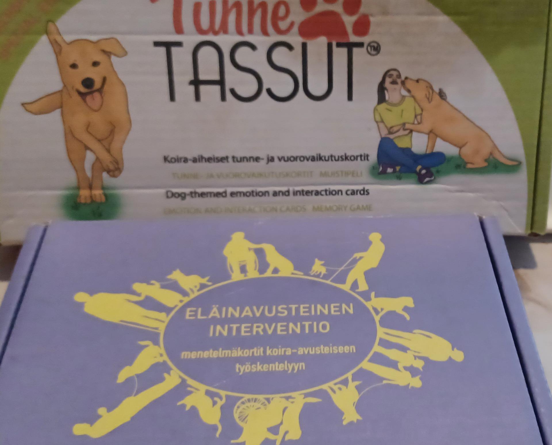 Käytössäni on monenlaisia erilaisia tuki menetelmiä, mm. erilaisia kuvatukia, erilaisia menetelmä kortteja, eläinavusteisen intervention menetelmäkortit, tunne & taito tassukortit koira-avusteiseen työskentelyyn.